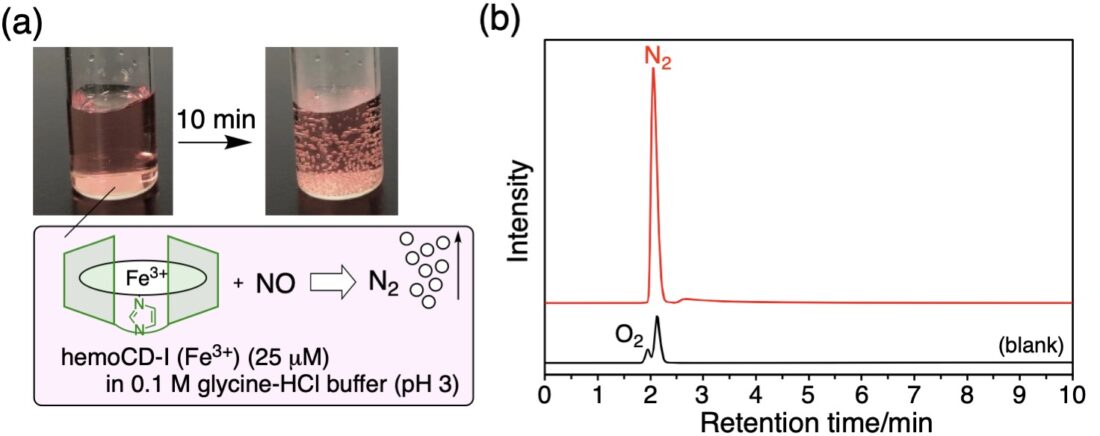 Denitrification is essential to remove toxic nitric oxide from industrial emissions and polluted water. So far, the industrial process has involved high temperatures. Professor Kitagishi’s group accidentally stumbled upon a new chemical mechanism of denitrification at room temperature and in aqueous solution. They report hemoCD-I/P supramolecules that bind nitric oxide and release nitrogen when in acidic glycine-containing solution. This pioneering finding will aid industrial denitrification and accelerate efforts to protect the environment.
